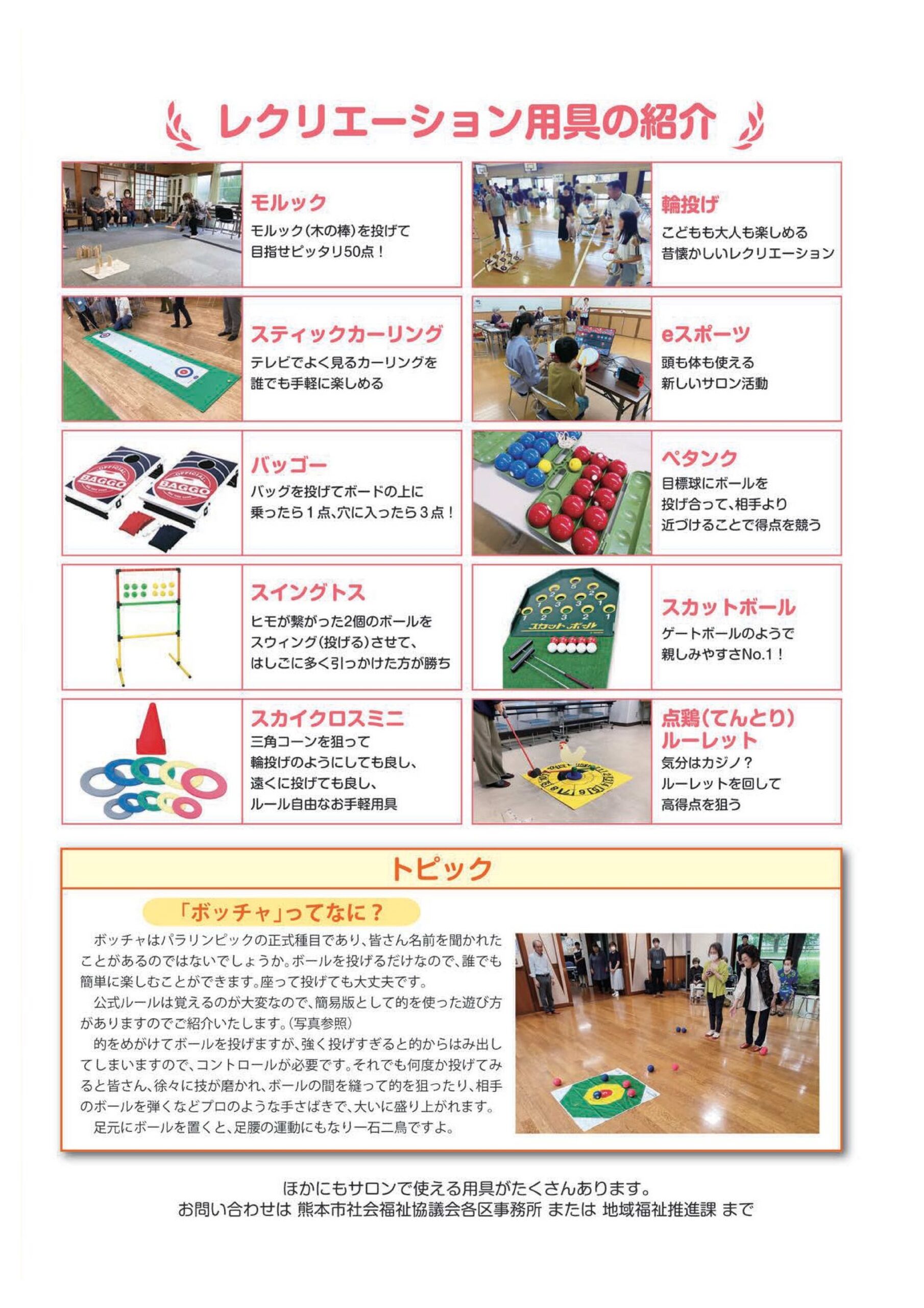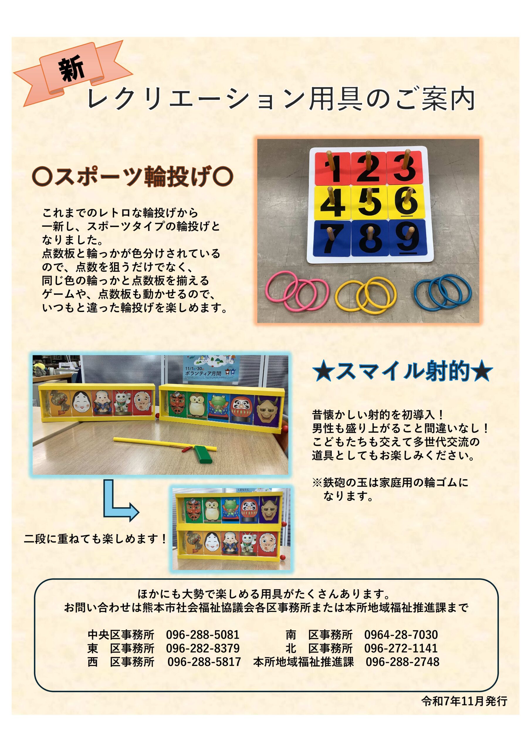 サロンで使えるレクリエーション用具の紹介 [2025-12-22] 熊本市社会福祉協議会ではふれあい・いきいきサロンや子育てサークルなどで使えるレクリエーション用具の貸し出しを行っています。 もちろん無料です。 今年はスポーツ輪投げと射的を導入し、さらにグレードアップ! レクリエーション用具を使って、普段のサロンに一味違った刺激を取り入れてみませんか? ご相談は市社協各区事務所または本所地域福祉推進課まで